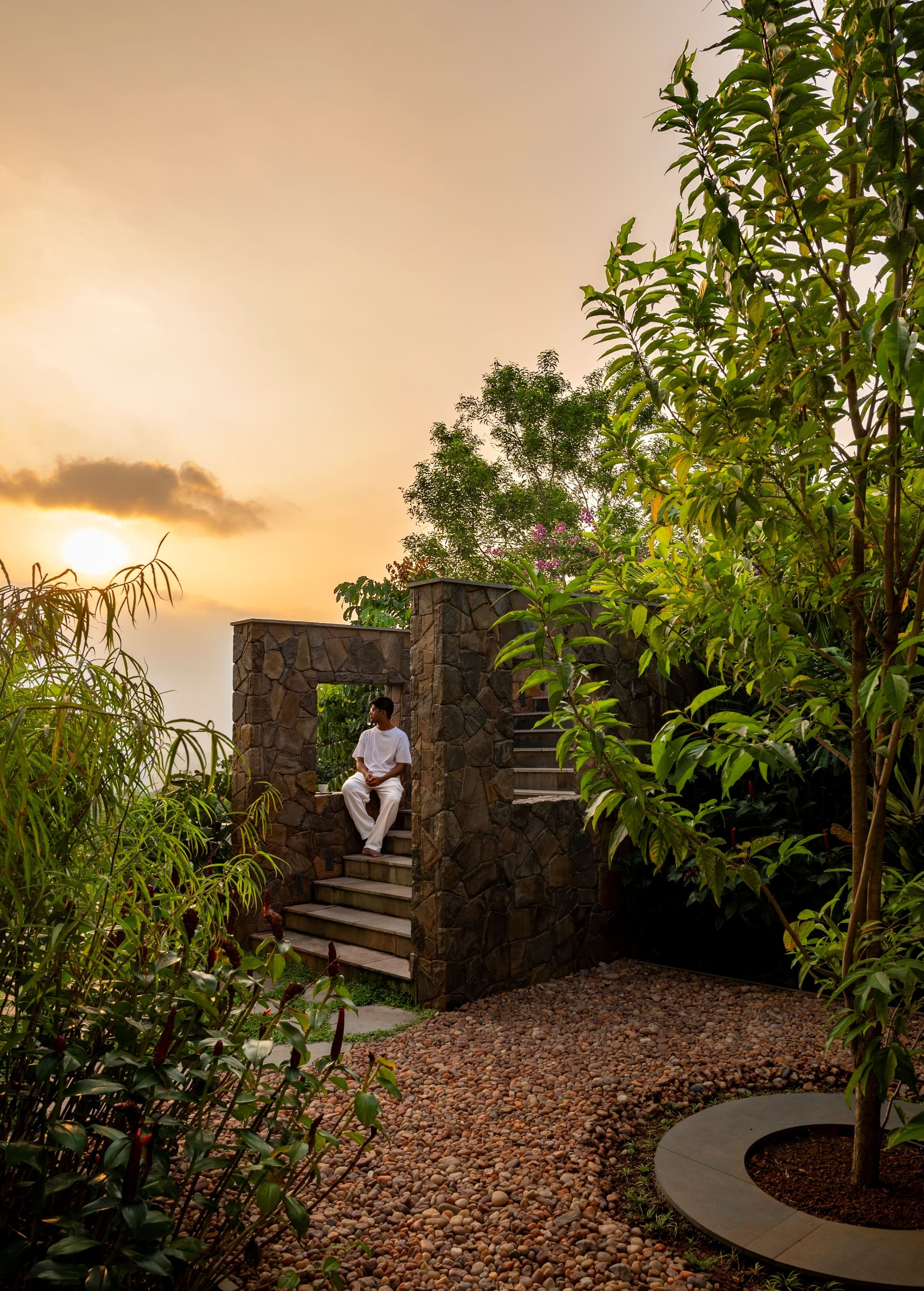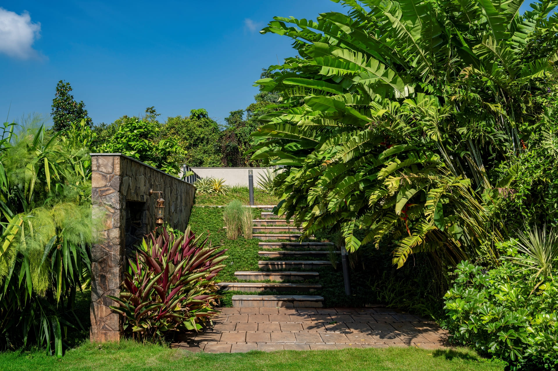 The site unfolds through layered courts — from the arrival plaza and ramped descent to the contemplative Parijat Court and the multi-functional Infinity Court for yoga and gatherings. Retaining walls with framed openings maintain visual continuity, while graded pathways ensure seamless movement across levels. A carefully curated mix of native and naturalized species stabilizes slopes, strengthens ecological resilience, and softens built edges, resulting in a landscape that is both immersive and deeply rooted in its terrain.