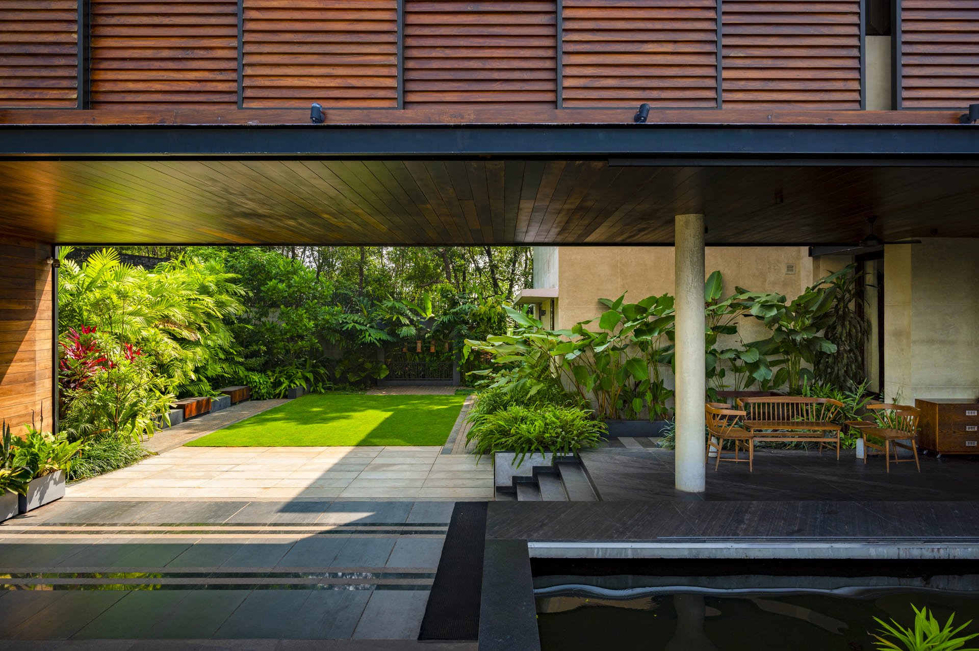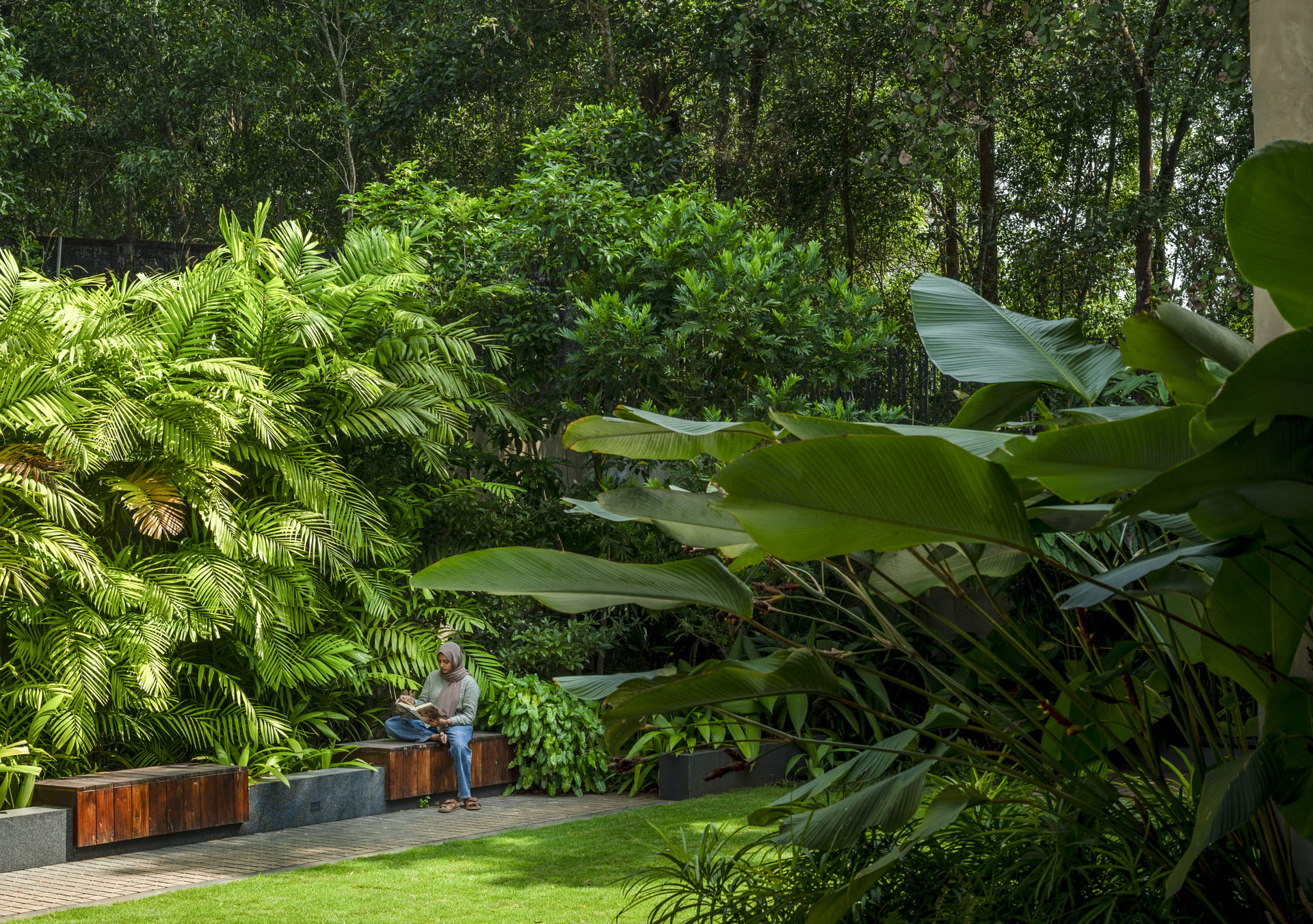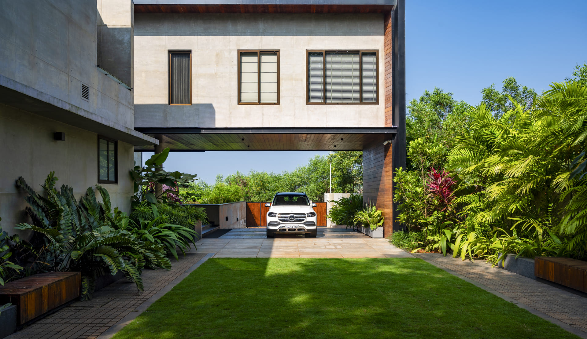 Set within the larger vision of Montana Estates, this 30-cent residential landscape is conceived as a seamless extension of the estate’s hillscape character — a refined fraction of the whole. The design responds to the sloping terrain and panoramic views through layered greens, structured lawns, and dense peripheral planting that visually merge the residence with the surrounding hills. Clean architectural volumes are softened by immersive tropical planting, allowing the built form to rest gently within its terrain.
