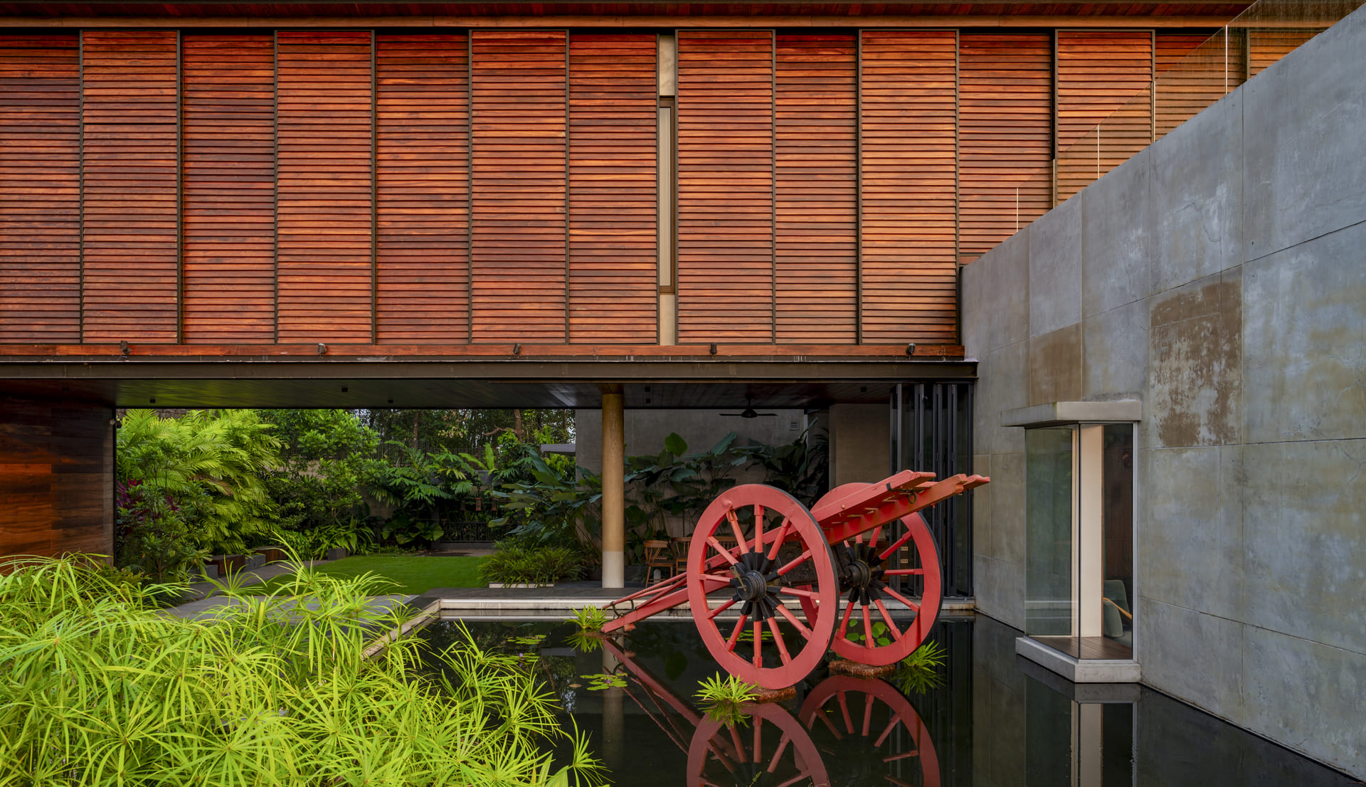 A key thematic layer is introduced through metallic lanterns and a reflective koi pond that anchors the forecourt. At its center, a vibrant bullock cart installation becomes a sculptural focal point — blending nostalgia with contemporary expression. The water surface mirrors the sky and the lantern glow, creating a poetic evening ambience. Together, these elements infuse the landscape with identity and memory, while remaining harmoniously integrated within the larger Montana hillside narrative.