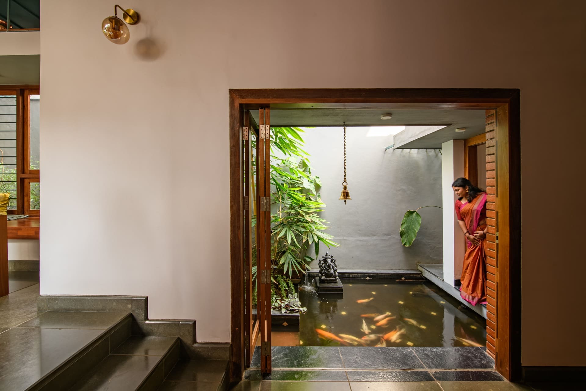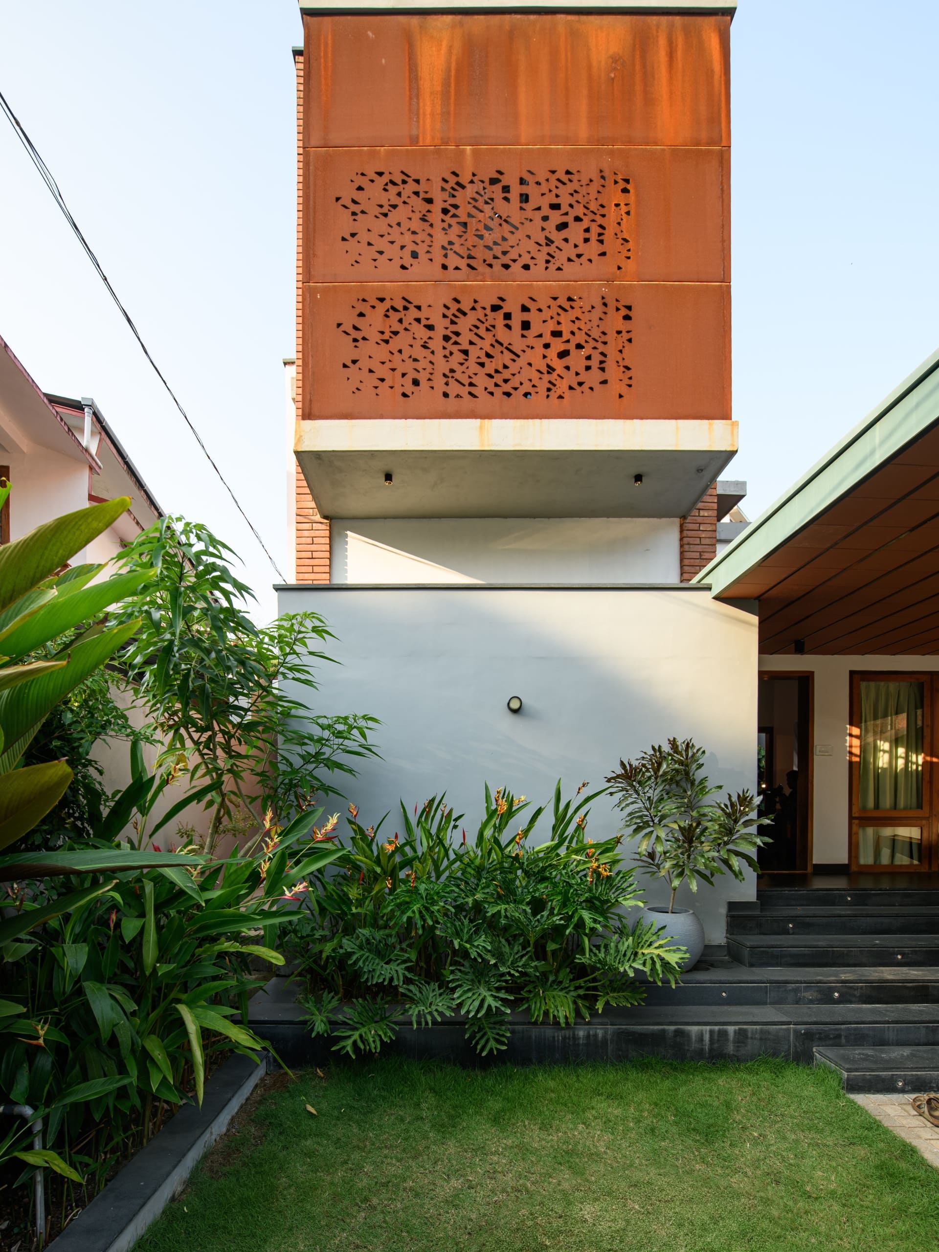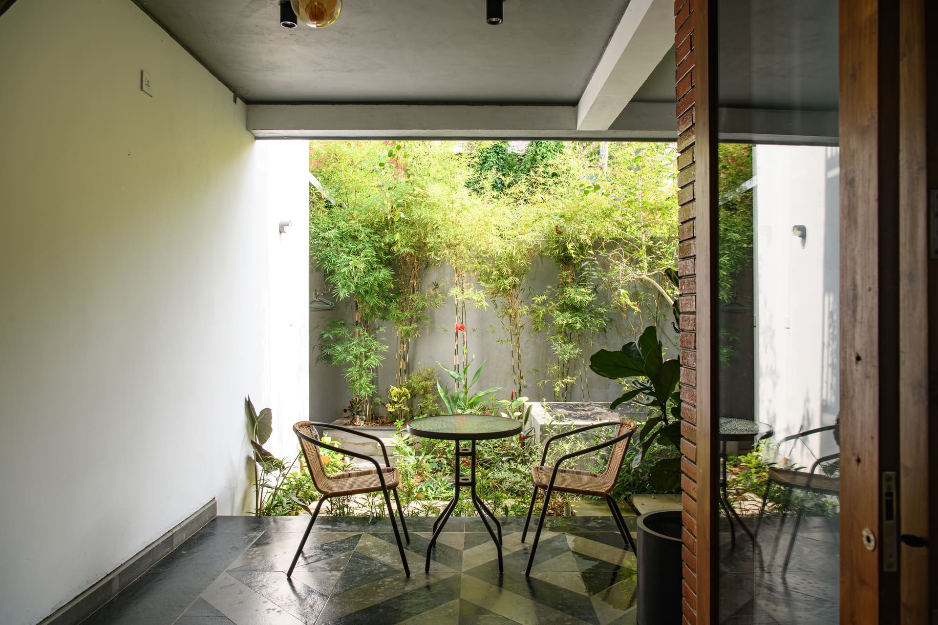 Vertical planting, textured steps, and framed openings create visual depth, making the small site feel generous and fluid. The transition between indoors and outdoors is seamless, allowing spaces to breathe beyond their physical limits. Through careful layering and spatial framing, the residence achieves a sense of openness and calm — proving that even a small plot can hold a large spatial experience.